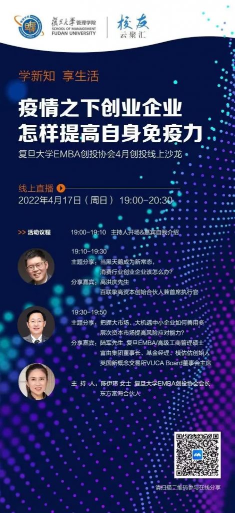 对此,复旦EMBA创投协会4月创投线上沙龙将于2022年4月17日(周日) 19:00-20:30在线上进行,此次邀请了三位行业专家在线与大家分享互动疫情之下创业企业怎样提高自身免疫力。