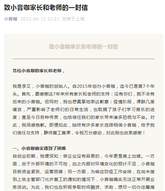 近日,小音咖创始人李艾在官方公众号发出一封《致小音咖家长和老师的一封信》,信中提到由于疫情严重影响了小音咖的正常营业,目前老师的课酬缓发,资金紧张、运营困难,正在积极争取时间融资、求助,并制定了“纾困计划”,承诺“尽力保障愿意接受复课且新增耗课老师的课酬先以打折的方式支付,剩余部分分期进行支付”,同时希望家长“暂缓退费”